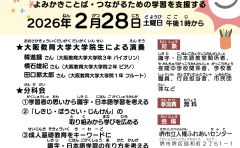 活動報告 【報告】第8回識字・日本語学習研究集会パート2 2023年1月28日(土)、大阪教育大学天王寺キャンパスにて、第8回識字・日本語学習研究集会part2を開催しました。オンライン参加者を含め約100人の方にご参加いただきました。当日ご参加いただいたみなさま、ボランティアとして運営を担ってく... 2023.02.02 活動報告調査・研究